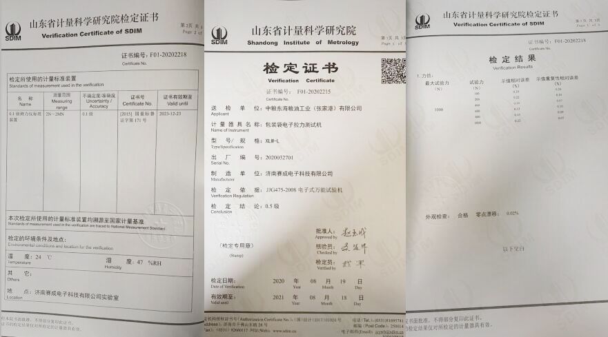 為了更好的交付這批設(shè)備,確保設(shè)備測試數(shù)據(jù)的準(zhǔn)確性,濟(jì)南賽成儀器向山東省計量科學(xué)研究院提出了檢定申請。依據(jù)JJG475-2008電子式萬能試驗(yàn)機(jī)的檢定規(guī)程,省計量院工作人員對XLW-L包裝袋電子拉力試驗(yàn)機(jī)的精度和誤差等進(jìn)行了檢定,經(jīng)檢定結(jié)論達(dá)到0.5級,檢定結(jié)果合格。2020年8月9日獲得山東省計量科學(xué)研究院頒發(fā)的檢定證書,獲得的這份檢定證書,進(jìn)一步證明了濟(jì)南賽成儀器符合預(yù)定要求和質(zhì)量要求,測量結(jié)果準(zhǔn)確,儀器持續(xù)可靠,性能穩(wěn)定。